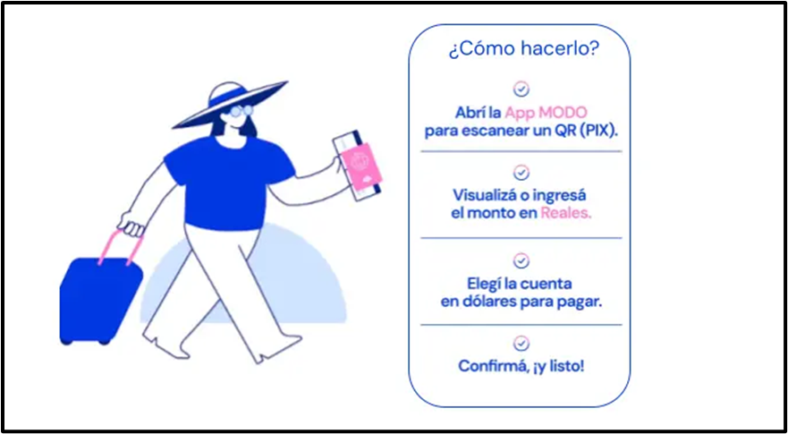 Ahora es posible pagar consumos con PIX -el sistema de códigos QR instantáneos de Brasil- en forma directa desde la APP MODO, utilizando los dólares de la cuenta de Banco Macro.