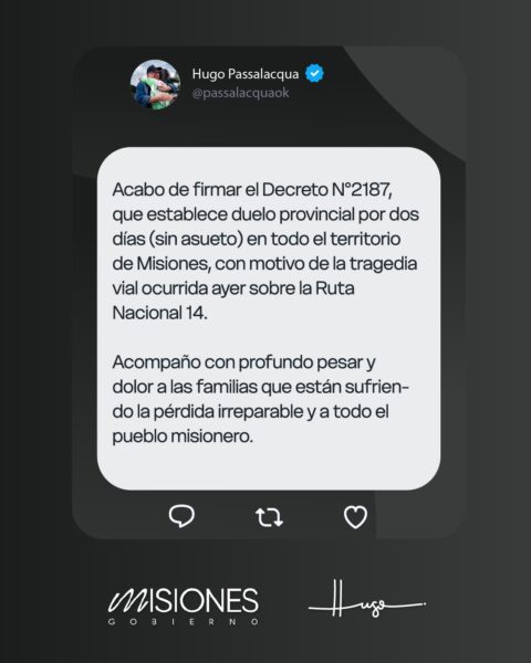 A través del Decreto N.º 2187 del día de la fecha, el gobernador de Misiones, Hugo Passalacqua, dispuso dos días de duelo en toda la provincia, a raíz del trágico accidente de tránsito ocurrido en la madrugada del domingo en Campo Viera.