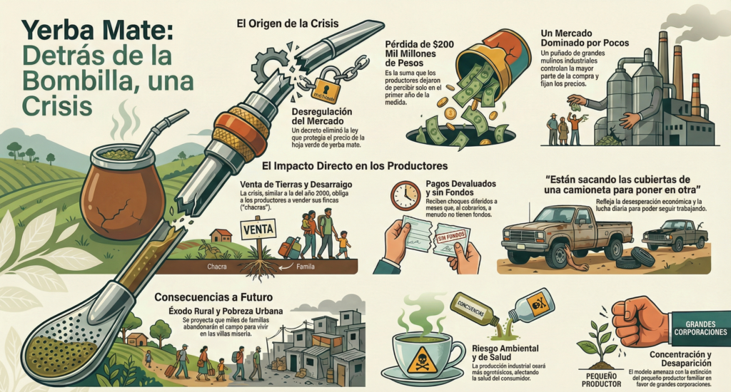 Esta situación se traduce en una brecha de precios alarmante: mientras el productor recibe aproximadamente 200 pesos por kilo de hoja verde, el producto final en góndola se comercializa entre 3.000 y 5.000 pesos. Para el presidente de APAM, el Decreto de Necesidad y Urgencia (DNU) solo sirvió para «regalarle a los industriales esa tamaña fortuna», rompiendo el equilibrio que antes garantizaba el INYM.