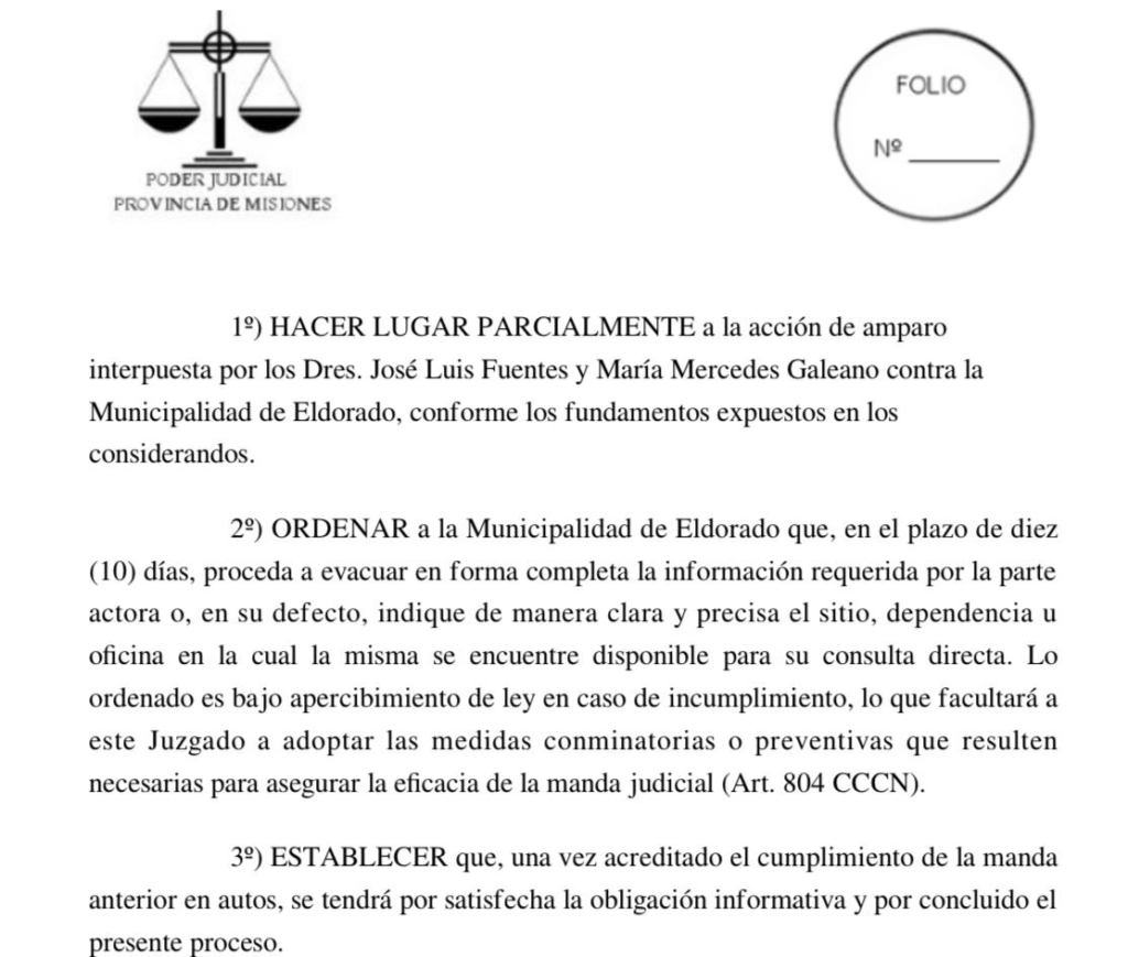 La Justicia de Eldorado hizo lugar al amparo promovido por los abogados José Luis Fuentes y María Mercedes Galeano contra la Municipalidad de Eldorado y ordenó al Ejecutivo municipal que, en el plazo de diez días, complete la información pública requerida mediante una respuesta unificada, orgánica e íntegra.