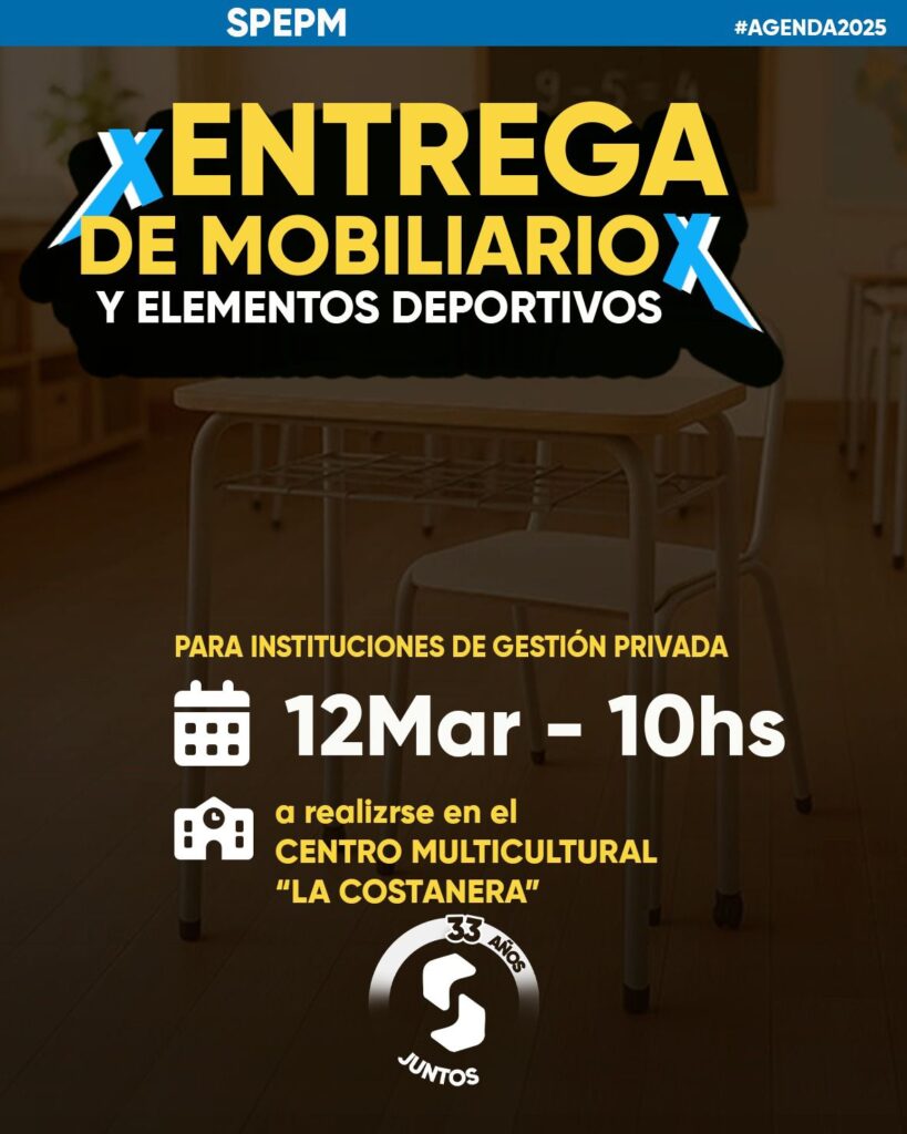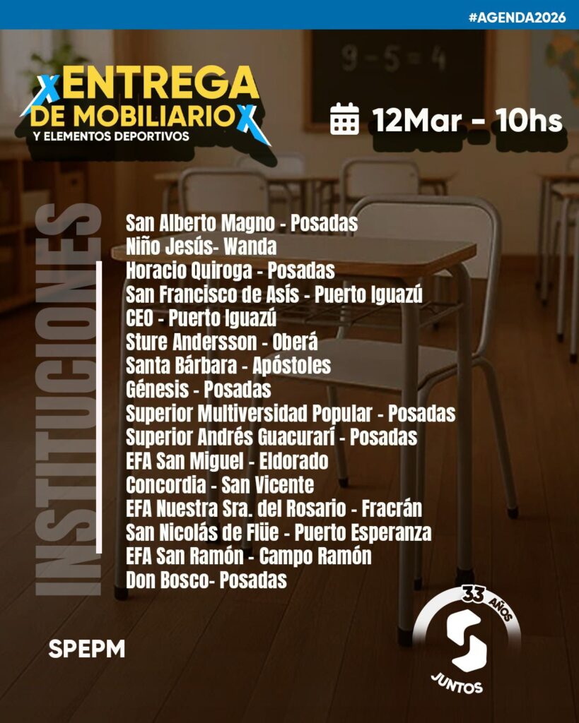 El próximo 12 de marzo, el Servicio Provincial de Enseñanza Privada de Misiones (SPEPM) realizará una nueva entrega de mobiliario escolar y elementos deportivos destinada a 16 instituciones públicas de gestión privada de la provincia.