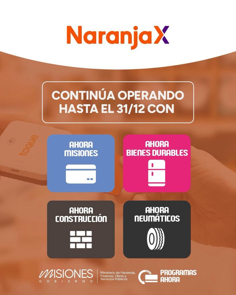 Tras la renovación de los Programas Ahora comunicada por el gobernador Hugo Passalacqua a partir del 1° de octubre, Tarjeta Naranja X, medio de pago que se había sumado a los programas en agosto pasado, confirmó su continuidad en Ahora Misiones, Ahora Construcción y Ahora Bienes Durables; y también amplió su participación sumándose al programa Ahora Neumáticos.